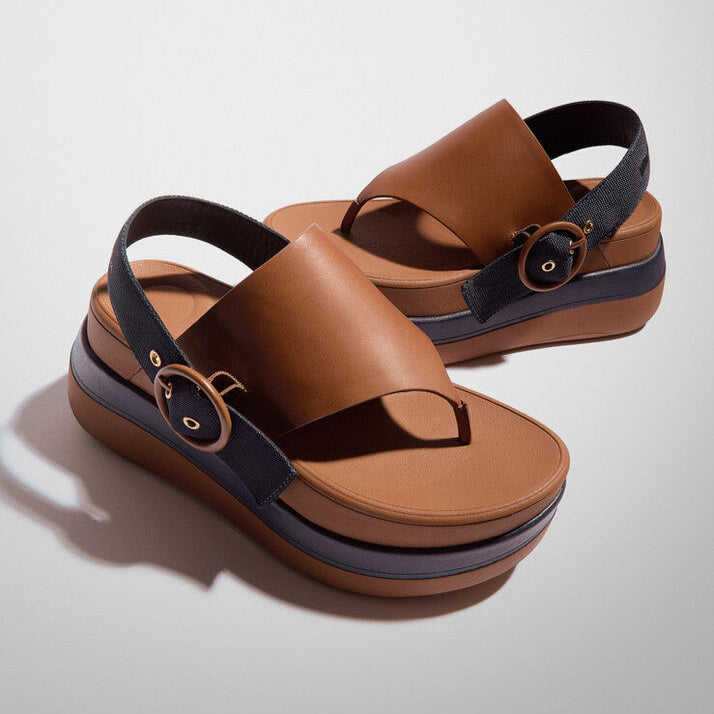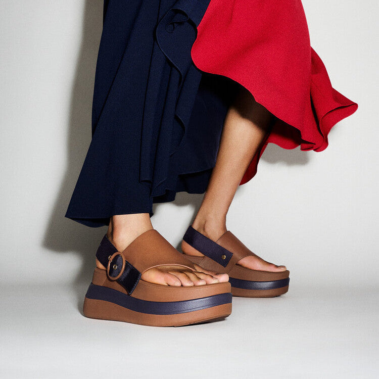 Launched at her SS25 London Fashion Week show, she teams the architectural 3-layer sole with a simple high-topline upper and strong colour blocking. In richly toned luxe leather. A logo’d webbing back strap adds security and contrast texture. On a platform-version of our cushioned Microwobbleboard™ midsole (naked footbeds give direct contact with the tech). Avant-garde and all-day comfortable.